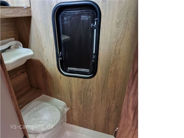Med toiletrum med kassettetoilet, køleskab og køkken.