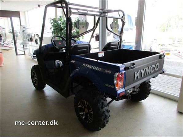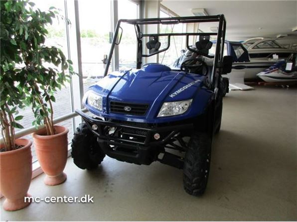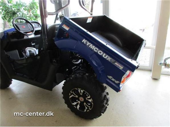 KYMCO UVX 500 I Ccm.: 500 Farve.: Blå Årgang.: 2016 Km.: 0 KYMCO UXV 500 Side by side Pris 64.900.- uden moms . Kan købes helt uden udbetaling via finansering... KYMCO UXV 500 I er en avanceret "side by side" model. Fuldt udstyret med blinklys samt for og baglygter. Solid stødfanger foran samt mulighed for montering af træk. Uafhængig affjedring med dobbelte triangler ved alle 4 hjul. Bagagerum under frontklap samt tipbart lad med bagklap. Fuld digital instrumentering med speedometer, kilometertæller, ur og advarsel for lav benzinstand. 12 volt strømudtag på instrumentbord. Aflåseligt handskerum. 3 punktseler ved fører og passagersæde. Kraftig styrbøjle. Motor Type: 1-cylindret vandkølet, 4-taktsmotor, med indsprøjtning. Effekt: 20 hk ved 5.500 om/min Drejningsmoment: 30,1 Nm ved 4.000 om/min Transmission: CVT (automatisk) Tekniske specifikationer LxBxH: 2.870 x 1500 x 1.850 mm Bremser: Skiver for (202 mm) og bag (200 mm) Vægt, tør: 525 kg